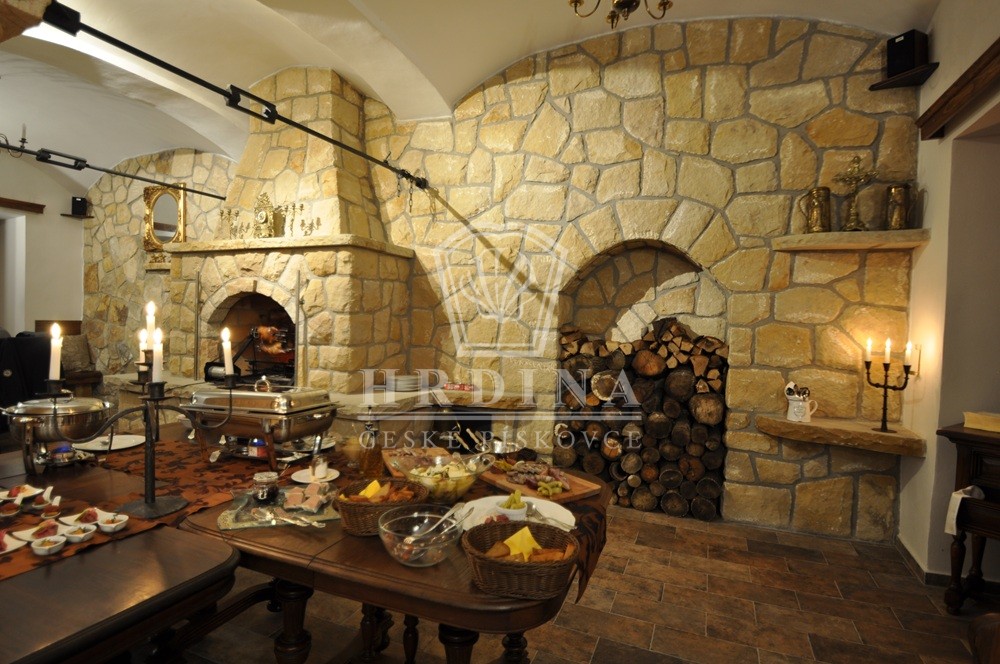 Ve Svatojánském dvoře jsme vytvořili unikátní prostor, kde se spojuje elegance anglického stylu s českým kamenem. Velký anglický krb s otevřeným ohništěm jsme navrhli do bývalé konírny, přetvořené na restauraci. Kámen, který byl použit, pochází z lomu Vyhnánov – stejně jako ten, který nese Pražský hrad nebo Karlštejn.