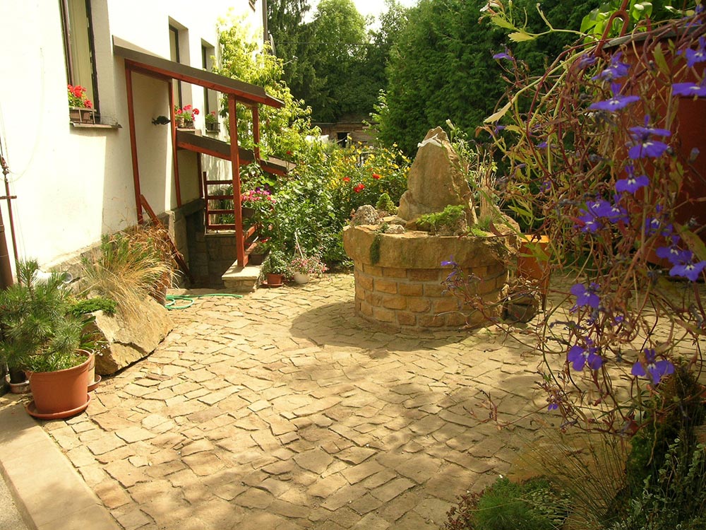 Studnu lze doplnit dlažbou nebo šlapáky a její okolí solitérními kameny tak aby zahrada tvořila jeden architektonický celek.
