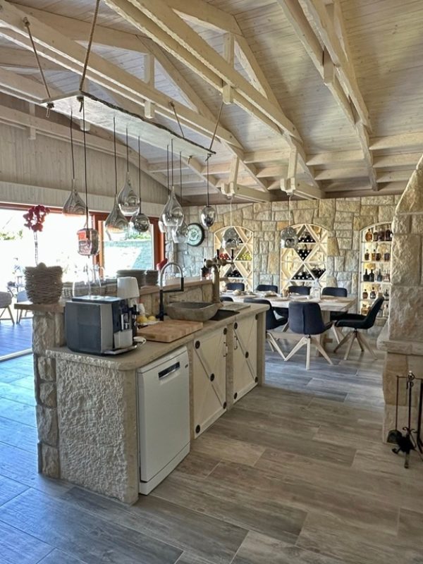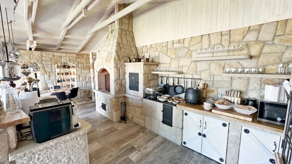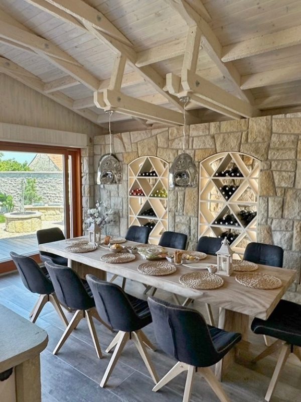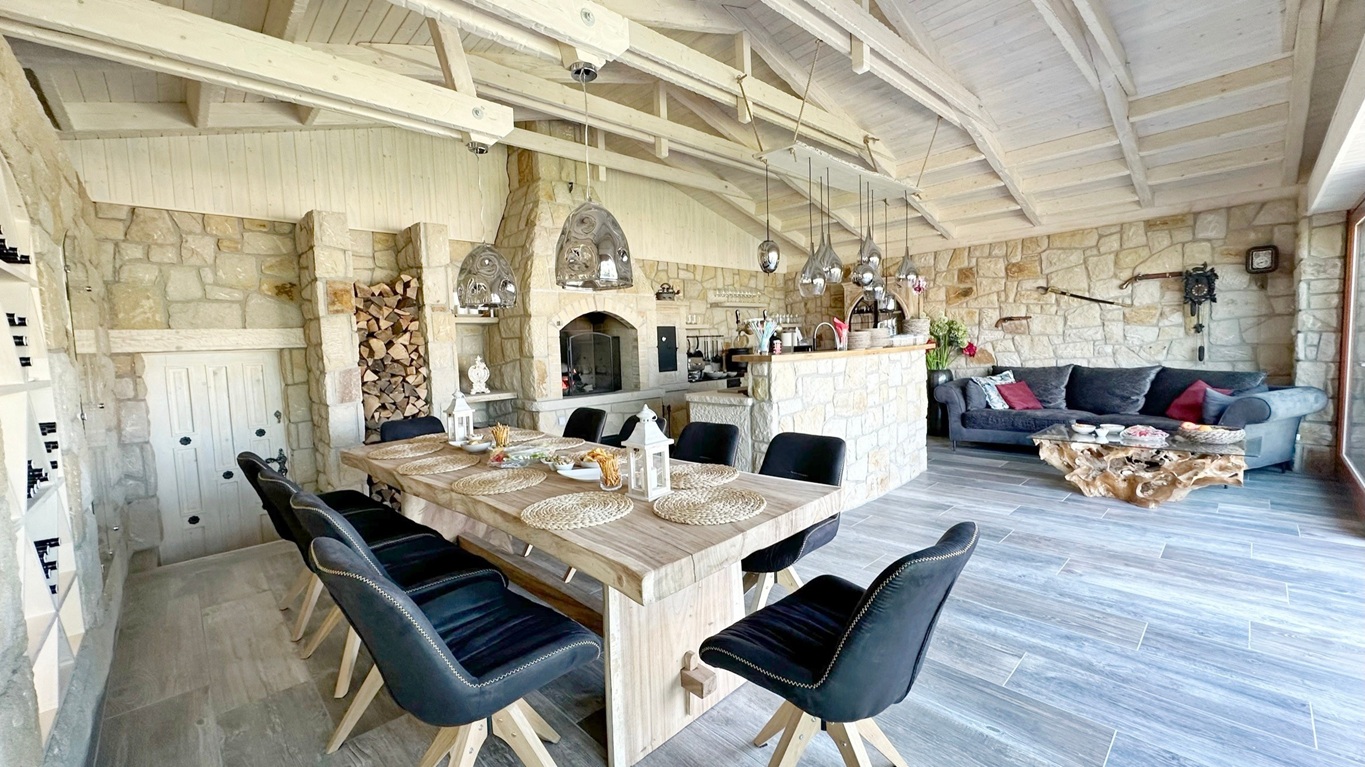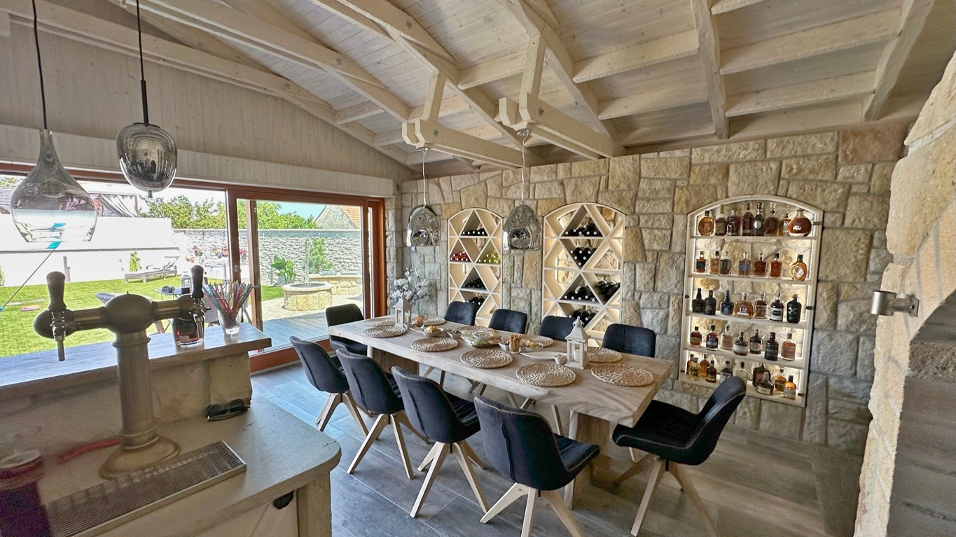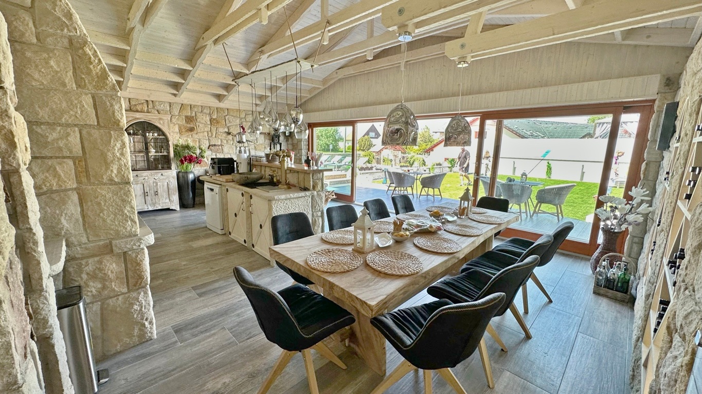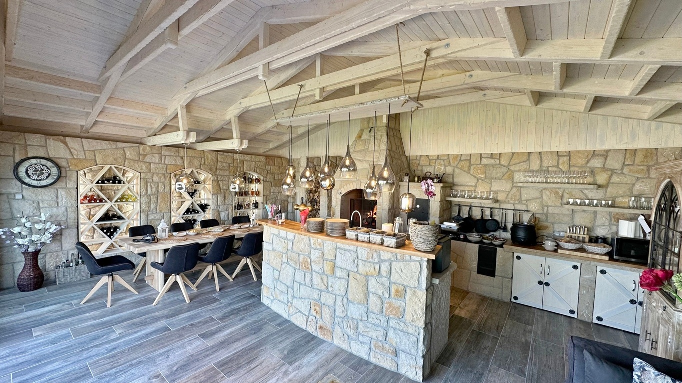 Tato zahradní kuchyně je navržena tak, aby splňovala nároky nejen soukromého využití, ale i každodenního provozu ubytovacího zařízení. Každý prvek má své přesné místo – od masivního kamenného obkladu až po precizní spárování a napojení jednotlivých částí.