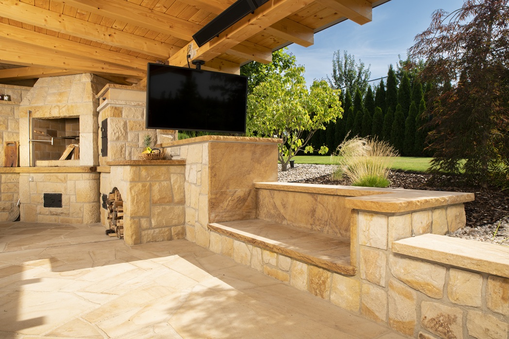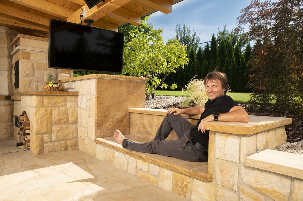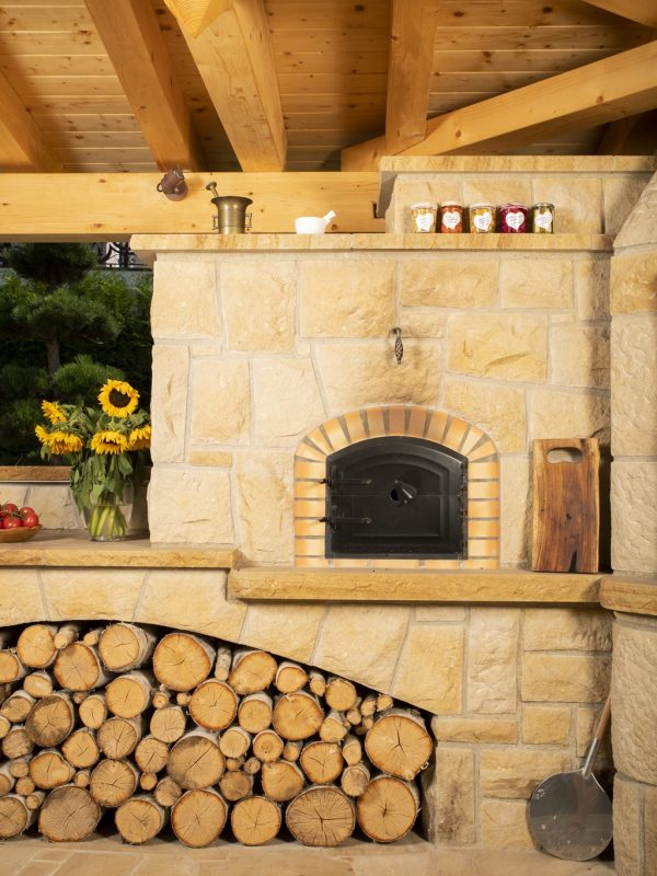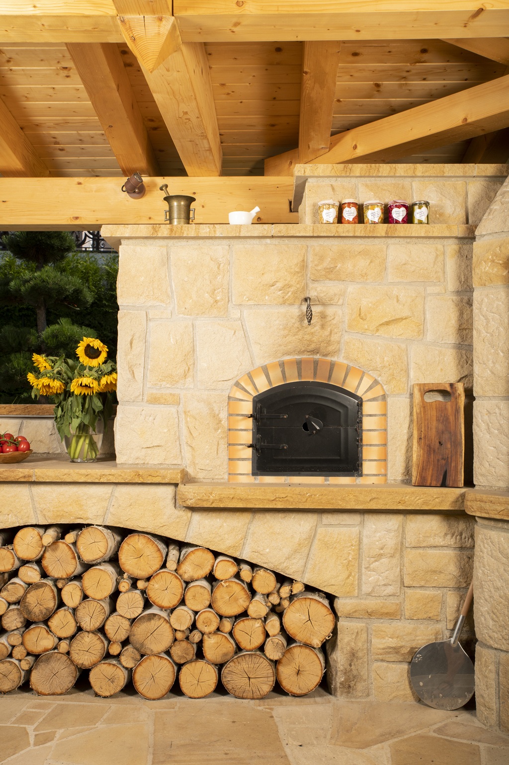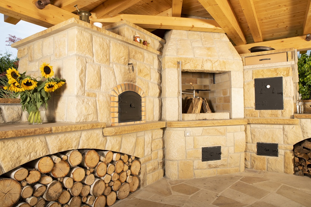 Plnohodnotná venkovní kuchyně s krbem, udírnou a pecí na pizzu