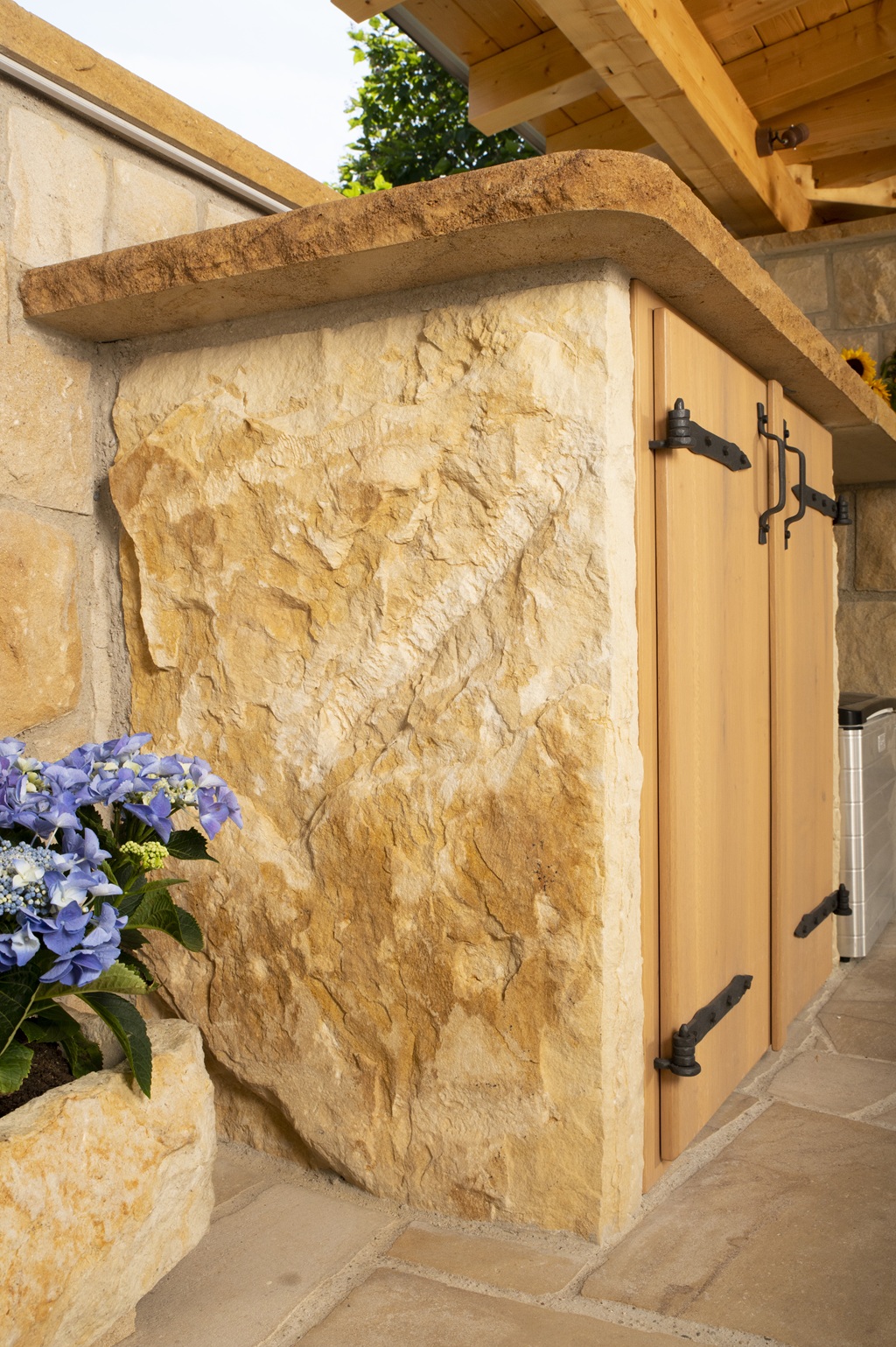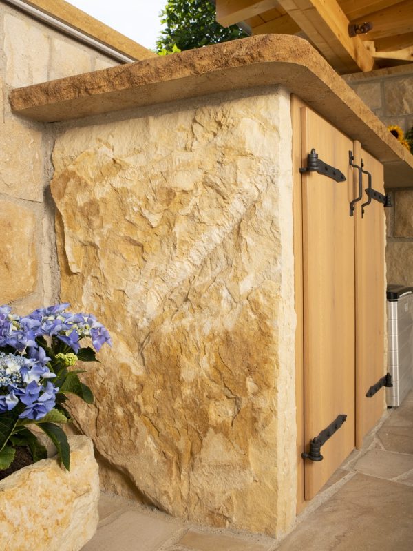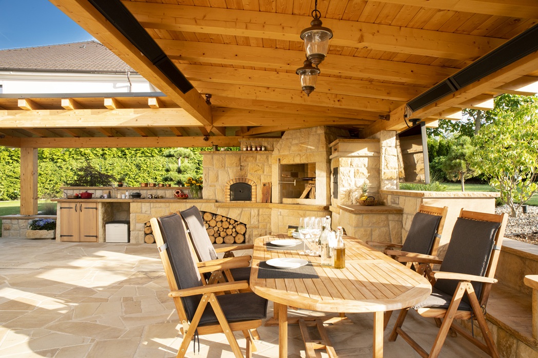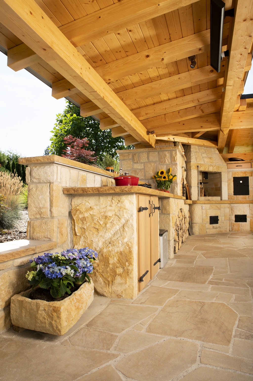 Součástí je dostatek úložných prostor, pracovní plochy i praktické řešení pro dřevo, což z ní dělá skutečně funkční zahradní kuchyň.