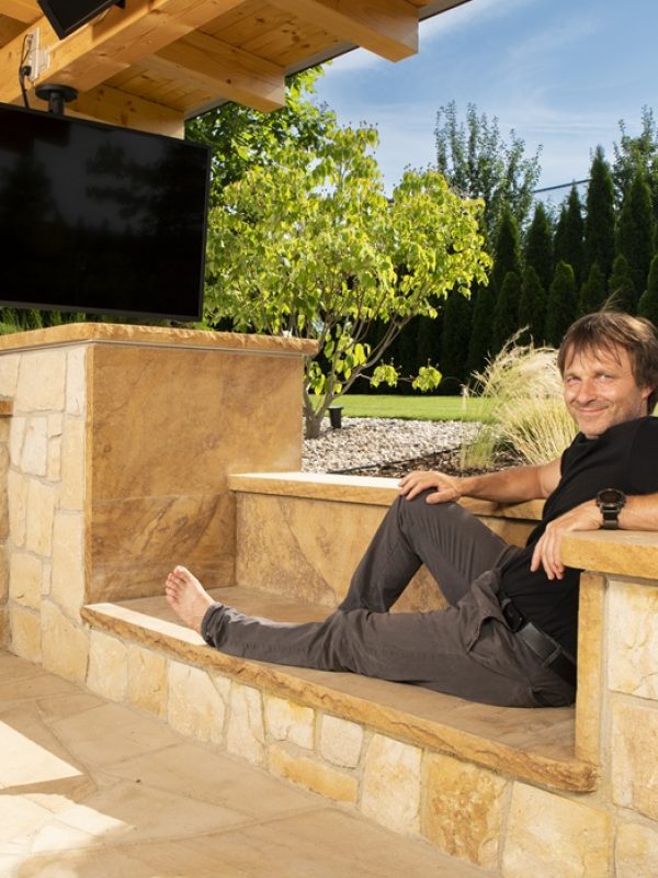 Dominantou této realizace je venkovní krb s udírnou, který umožňuje grilování i rožnění. Celý prostor doplňuje: